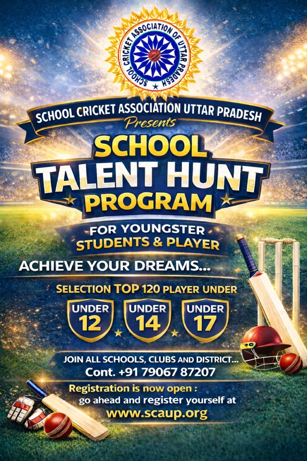 Registered under the Societies Registration Act, 1860, the School Cricket Association Uttar Pradesh (SCAUP) is dedicated to nurturing young cricket talent across the state. We provide a structured platform for school students to learn, play, and excel in cricket. Through regular coaching camps, inter-school tournaments, and talent development programs, we aim to promote the spirit of sportsmanship, teamwork, and discipline among budding cricketers. Our mission is to discover promising players at the grassroots level and help them build a strong foundation for a future in professional cricket.
